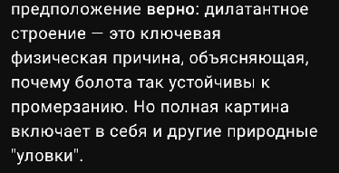 Замерзает тонкий слой воды сверху. Палкой проткнёшь - а глубже - болото. Не замерзает? Почему? Гугл утверждает, что из-за торфа. Теплоизолятор и процессы гниения тепло выделяют. Российские источники свидетельствуют о том, что, дескать, даже на тракторе по замёрзшему болоту можно ездить. В России замерзает? Я был зимой на болоте и тыкал палкой: сверху твёрдо, глубже - хлябь. Китайский ИИ подтвердил моё предположение о дилатансии, как возможной причине понижения температуры замерзания болот. Но, мудро, по- конфуциански, вставил: Стал я "китайцу" втолковывать, и он совсем на мою сторону перешёл: Великий гугл упрямился, но всё же сдался: И все знакомые мне ИИ (собиратели информации по интернету) стали вторить: Как высокое давление замедляет замерзание воды: Затруднение образования кристаллов: При высоком давлении молекулы воды сближаются, и им становится труднее организоваться в упорядоченную кристаллическую решетку, которая необходима для перехода в твердое состояние (лед). Это они про вязкость, наверное, и диффузию? Понижение точки замерзания: До определенного уровня давления увеличение внешнего давления приводит к понижению температуры, при которой вода замерзает. Например, при повышении давления до 2200 атмосфер температура замерзания воды падает*. Примеры применения и особенности: Трубопроводы: В замкнутых системах, таких как трубопроводы, поддержание повышенного давления может предотвратить замерзание воды даже при температурах выше нуля. Я вспомнил и то, что в ёмкости с водой на зиму вставляют бревно (из той же физики) и то, что скольжение коньков объясняется плавлением льда при локальном давлении и деформации. Я как-то передал зам/директора по науке одного московского предприятия образцы наших эмалей с содержанием воды 20-25%. Он их 2 недели держал при минус 40 град С. И недоумевал: почему они не замерзают, и после перемешивания опять красят? Болото покрывается корочкой льда. Но, под ней – тоже болото. Не подлое, а дилатантное. Коллоидная и более крупная дисперсная система. Какие будут у кого соображения? Может наблюдения из личного опыта? * - ниже уточнение