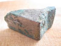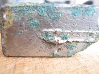 Добрый день профессионалы своего дела. Заранее извиняюсь если не в тот раздел создал тему. Перестилал дома пол и нашел железяку (см. фото). Явно спилен от чего-то большего ). Помогите определить состав или если быть точнее мусор или чего стоит? :-). Характеристики: Цвет - белый; Пролежал в земле не менее 20 лет из-за чего появилась коррозия, но зеленого цвета; по весу удивил - тяжелый как будто магнит; не магнитится; ка'пал йод на 1-2 минуты, вытер ватой и никакого пятна не осталось; состав плотный и даже при всей моей силе поцарапать его ножом, получаю очень маленькие царапины и совсем неглубокие; на воду не реагирует - мыл когда нашел. Заранее спасибо за помощь.