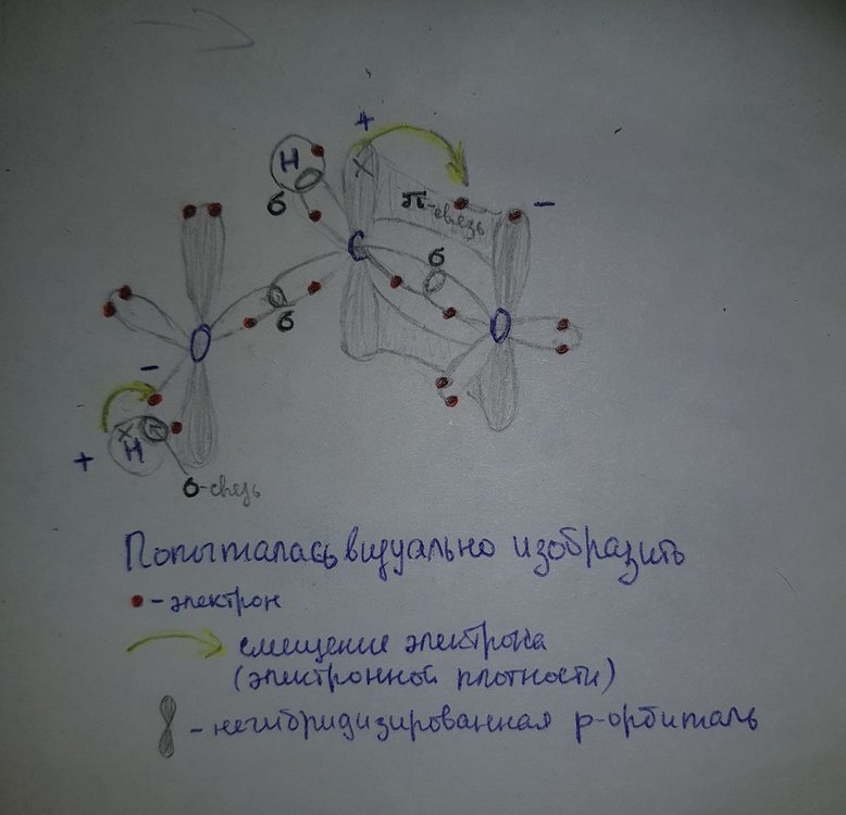 Здравствуйте! Пытаюсь познать органику, у меня возник такой вопрос при изучении строения карбоновых кислот, а в частности их карбоксильной группы. Я поняла, что электронная плотность п-связи C-O смещается в сторону кислорода, так как он более электроотрицателен, и в итоге он принимает как бы отрицательный заряд, а у углерода, чей электрон смещён в сторону кислорода, остаётся положительный заряд. И углерод этот положительный заряд пытается компенсировать. Но я не понимаю за счёт чего именно. Он электронную плотность в о-связи с другим кислородом смещает в свою сторону(смещает электрон кислорода в свою сторону)? Или углерод пытается как-то забрать неподелённые электроны пары с негибридизированной p-орбитали у этого кислорода? Или происходит что-то другое? Но в итоге, насколько я поняла, потом уже кислород пытается компенсировать это смещением электрона водорода в свою сторону, и тем самым связь O-H приобретает большую полярность, водород остаётся с положительным зарядом, без электрона, становится более подвижным и способным к отщеплению => и при диссоциации образуется уже карбоксилат-ион, у которого электронная плотность распределяется более равномерно. Как я поняла, за счёт этого они и считаются кислотами, так водород при диссоциации спокойно отщепляется. Но главный вопрос, за счёт каких электронов/электрона компенсируется углерод? Откуда углерод забирает электрон(ы) у кислорода? Простите, возможно я много чего перепутала, буду благодарна за разъяснение.. Не смогла найти чёткого и полного ответа на просторах интернета. Заранее спасибо!