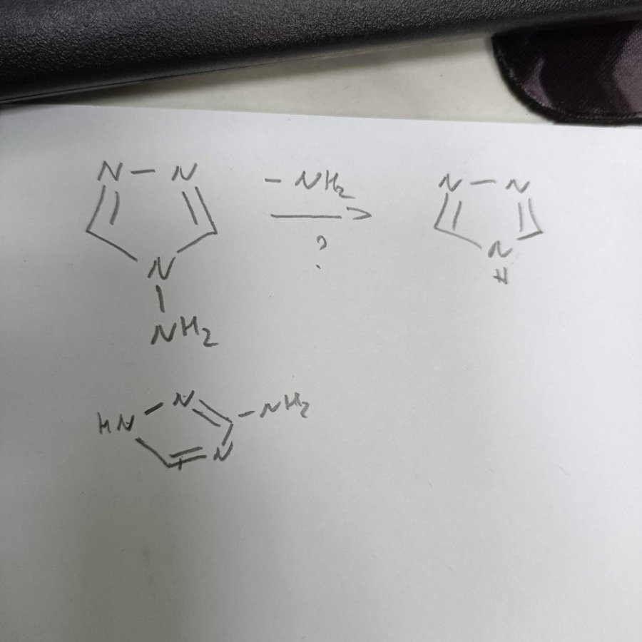 Коллеги! Получил задачу синтеза 1,2,4-триазола. Пока могу сварить 3 и 4-амино производные. Есть ли рабочий метод их дезаминировать? Спасибо за методику Видел методики в СОП через тиосемикарбазид, вонять серой не хочется. -