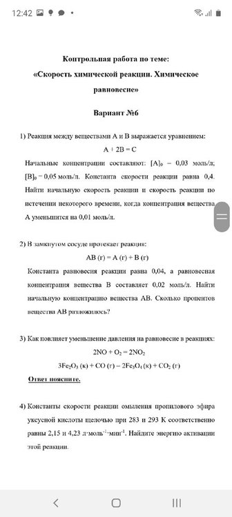 1. Найти температуру, при которой константа равновесия реакции 4НС(г)+O2(г)↔2H2O(г)+2Cl(г) равна единице. Записать выражение для константы равновесия данной реакции. 2. Разложение N20 на поверхности золота при высоких температурах протекает по уравнению 2N20(г)↔2N2(г) +O2(г). Константа скорости данной реакции равна 5*10-4 Начальная концентрация N20 - 3.3 моль/л. Определить скорость реакции при заданной температуре в начальный момент времени и в тот момент, когда разложится 25% N20.