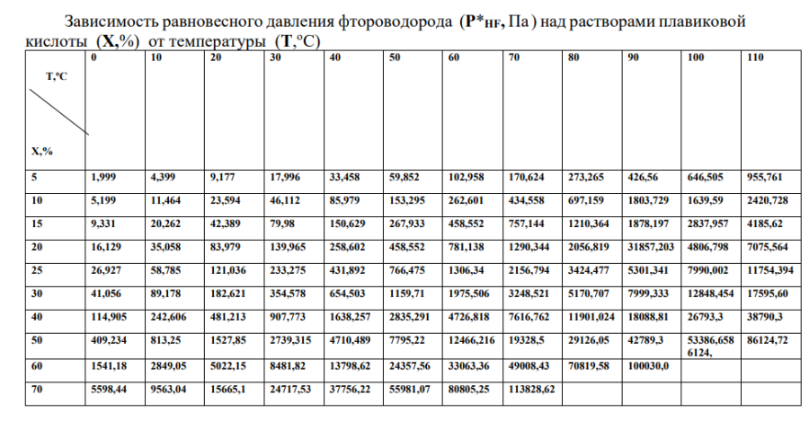 Какова максимальная концентрация плавиковой кислоты, получаемой из газа, содержащего 3%об. HF, при температуре 70 С и давлении 1 атм. ? Как изменится концентрация кислоты, если содержание HF в газе понизится до 2%? Как предотвратить снижение концентрации кислоты путем изменения условий абсорбции, покажите расчетом