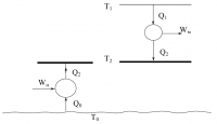 Помогите, пожалуйста! (Если что-то не понятно по условиям, то смело спрашивайте=)) Q2 = 100 кДж, Т0 = 298 К, Т1 = 800 К, Т2 = 370 К, Кн = 0,4, Км = 0,5 Рассматривается два случая подвода теплоты Q2 потребителю при температуре Т2 . В первом случае Q2 подводится путем передачи теплоты от окружающей среды (Т0) с помощью теплового насоса. Во втором случае теплота подводится от топливной энергоустановки с температурой Т1 (см. рис.). Для теплового насоса коэффициент преобразования ϕ работы Wн в теплоту Q2 = ϕ*Wн, передаваемую потребителю при температуре Т2, равен ϕ = Кн*ϕТ, (0