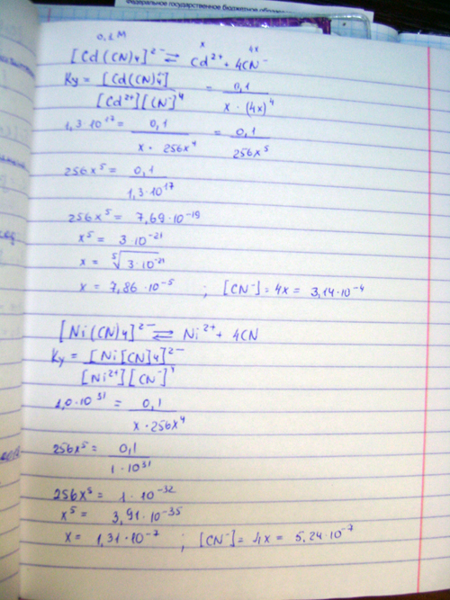 По идее, концентрация ионов [CN-] будет больше у [Ni(CN)4]2- , по моим расчетам получается, что у [Cd(CN)4]. Может, я не так считаю?