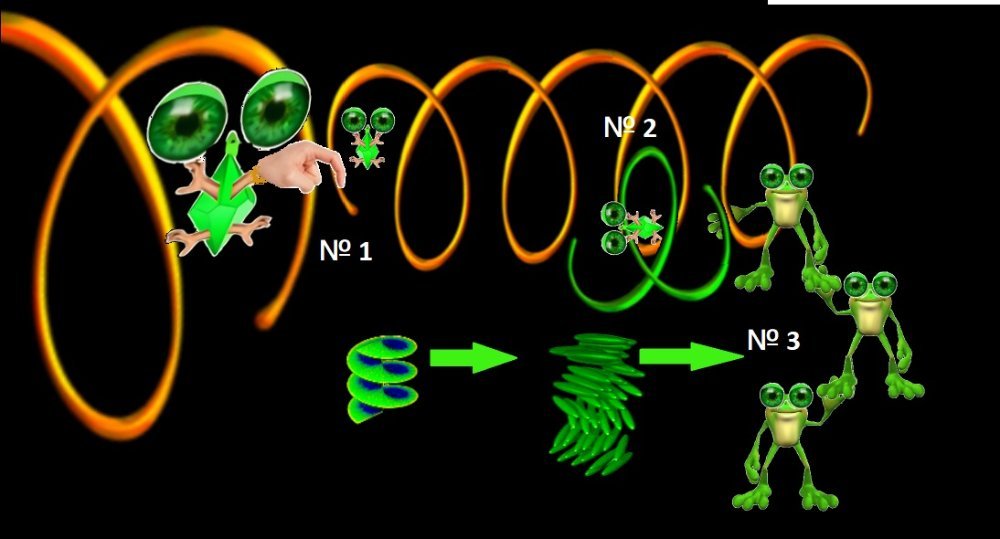 Позиция №3. Образование геликоидов. И на моделях чётко видно винтовые структуры. И композиции показали свойства смектиков С (тип жидких кристаллов) с характерными для них сегнетоэлектрическими свойствами. Это я ещё в 90-х успел получить по ним консультацию последнего, может быть, "зубра" в области жидких кристаллов((