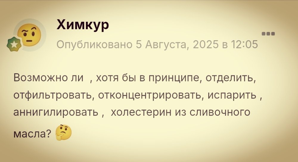 dmr Опубликовано 7 Августа, 2025 в 09:57 Поделиться Опубликовано 7 Августа, 2025 в 09:57 В 07.08.2025 в 14:13, Химкур сказал: Вопрос был: возможно ли очистить сливочное масло от холестерина Вопрос был задан скорее всего не настолько корректно и не настолько правильно поэтому и ответы такие От холестерина как от спирта очистить масло скорее всего невозможно не нарушив саму структуру масла Потому что холестерин как спирт в масле отсутствует Если же вопрос поставить возможно ли очистить от холестерин содержащих липидов, а именно от тех которые Малой плотностью, то вопрос скорее всего решаем Как вы и предполагали на сепараторе но не на обычном молочном конечно она более высокоскоростном Но при этом вполне возможно потеряется очень много того что в масле полезного есть То есть масло скорее всего просто разделится на какие-то фракции и в какой-то из этих фракций Будут те самые липиды Малой плотности содержащие холестерин Ну оставшиеся масло конечно будет уже совсем не то самое масло которое люди любят кушать Поэтому если вы уж так сильно озабочены этой проблемой кушайте масла полученные из растительных Кушайте маргарины майонезы и прочие заменители сливочного масла Ссылка на комментарий