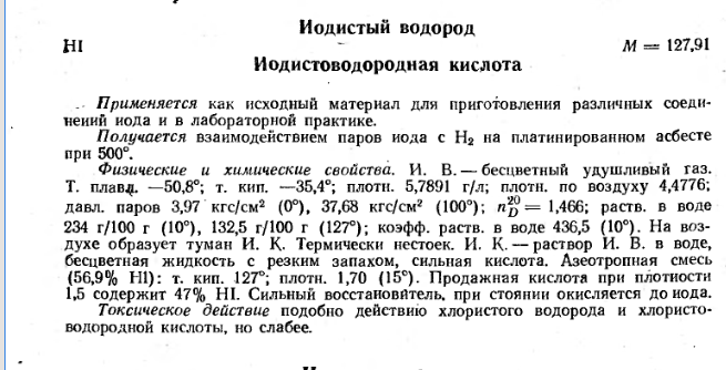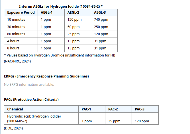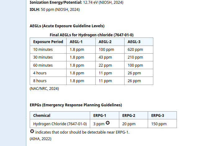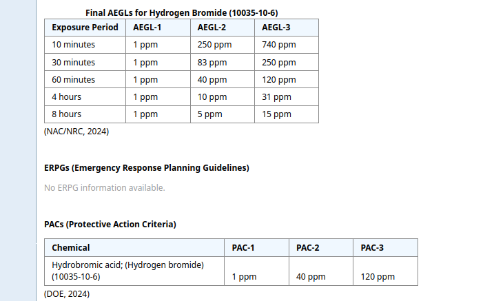 Думал что хлороводород самый безопасный из галогенводородов но там все запутано по ПДК и экспозициям. пиковые экспозиции у бромоводорода выше на 10 минут, в то время как долгосрочные хлороводород безопаснее. Однако уже обсуждали что данные по этому сайту бред а если брать данные из "вредных веществ в промышленности" фтороводород на порядок (минимум) ядовитее хлороводорода, после фтороводорода идет бромоводород, потом хлороводород и самый безопасный внезапно иодоводород. Насчет того что фтороводород ядовитее на порядок хлороводорода и чуть токсичнее хлора я склонен верить ( по своим ощущениям). С бромоводородом не сталкивался