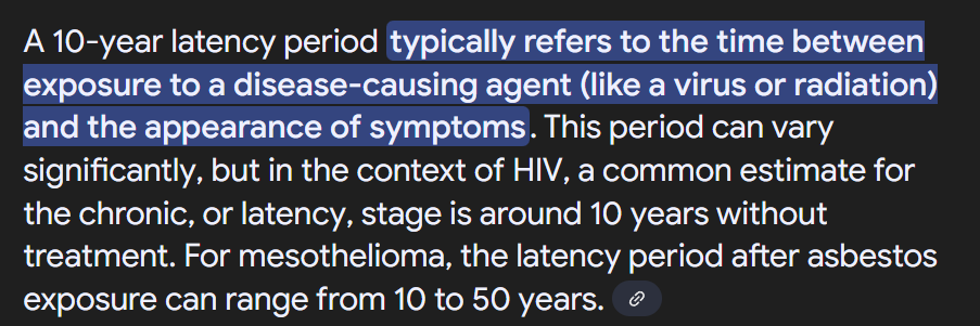 я согласен что если есть долгодействующий фактор ну тот же радионуклид вот тогда да оно может вылезти на фоне общего ослабления иммунитета. А если это некий текущий процесс то с какой стати ему годы в стазисе валяться, он либо помрэ, либо уже скоро себя проявит, как минимум это будет хроническое воспаление)