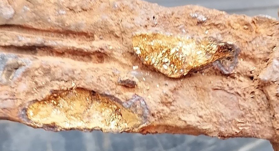 Здравствуйте, Уважаемые знатоки химии! Помогите, пожалуйста, разобраться со следующим вопросом. Есть древний скифский акинак, возраст 2500 лет минимум. Акинак извлечен из земли и покрыт толстым слоем окислов и ржавщины. Стал чистить, на рукоятке кусок ржавщины отвалился, кажется внутри он был полым и обнаружилось следующее (на фото). По блеску и цвету напоминает золото, не магнитится, в уксусе цвет не меняет. Что это может быть? Древние состоятельные воины-скифы украшали рукояти своих мечей золотой обкладкой, если можно так сказать фольгой, т.е. железную рукоять оборачивали такой золотой фольгой или листом золотым и инкрустировали на нем различные орнаменты. Если на представленном мече остатки какой то золотой обкладки, то почему данная обкладка так развалилась, превратившись в практически пыль, ведь золото не гниет , а если это какая то ржавщина, то почему она напоминает золото? Просветите, пожалуйста, по данному вопросу. Спасибо!