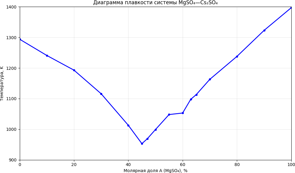 Затрудняюсь с определением типа данной диаграммы (просто диаграмма с эвтектикой, диаграмма с перитектикой, двойной эвтектикой?), а следовательно и с определением фазовых областей и их состава. Смущает перегиб при температуре 1053 (C = 60%), не понимаю, что это и как повлияет на подпись соответствующих областей (диаграмма строилась по табличке).