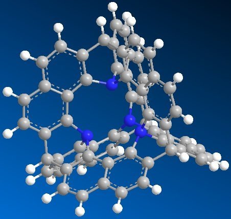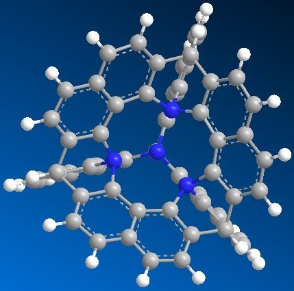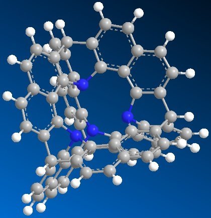 Интересует, есть ли информация по данному соединению, именно по свойствам, конкретно по теоретическому (если оно и не было синтезировано, то может быть по данному соединению были какие-то теоретические расчёты) или практическому использованию в качестве "протонной губки"? То есть, если это соединение может существовать и захватывать протоны, то протон будет в центре, а атомы азота - по вершинам правильного тетраэдра. Синие атомы - атомы азота, серые - атомы углерода, белые - атомы водорода. Изобразить структурную формулу в двухмерном пространстве, не рискнул. Химическая формула - C64H28N4.
