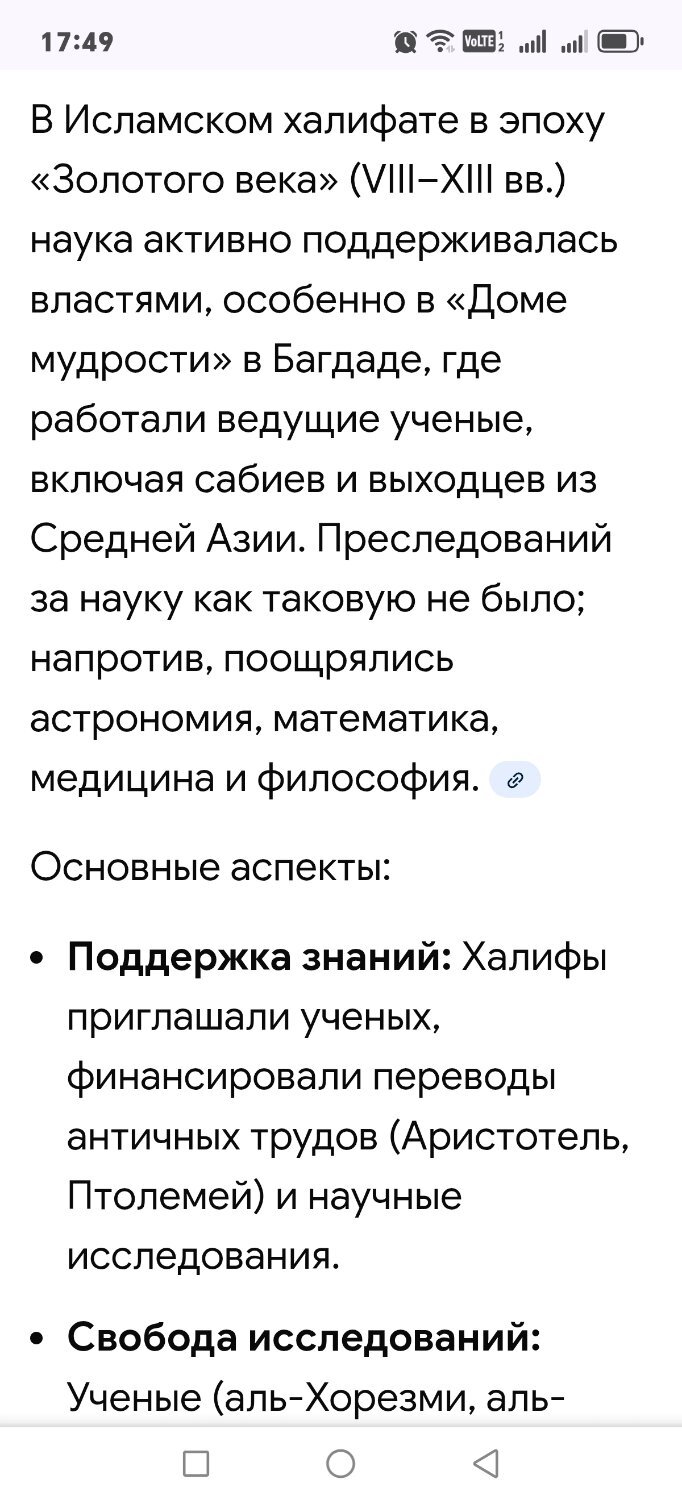dmr Опубликовано 31 Января, 2026 в 12:52 Автор Поделиться Опубликовано 31 Января, 2026 в 12:52 Исламская наука этого периода стала фундаментом для развития науки в Западной Европе https://www.google.com/search?q=преследовали+за+науку+в+исламском+халифате&client=ms-android-honor&hs=oCbU&sca_esv=5eff3cc154b4857b&sxsrf=ANbL-n4PCM_6gXGt8GxfbwxifHPslhv2MA%3A1769863617558&ei=wfl9aaLcIYGGxc8Ppq2ygQ8&oq=Преследовали+за+науку+в+исламском+хал&gs_lp=EhNtb2JpbGUtZ3dzLXdpei1zZXJwIkXQn9GA0LXRgdC70LXQtNC-0LLQsNC70Lgg0LfQsCDQvdCw0YPQutGDINCyINC40YHQu9Cw0LzRgdC60L7QvCDRhdCw0LsqAggAMgUQIRigAUjC3QFQxCJYxtEBcAZ4AJABAJgBiAOgAchBqgEIMC4zNS44LjG4AQHIAQD4AQGYAjCgAsFAwgIKEAAYsAMY1gQYR8ICCBAAGIAEGKIEwgIFEAAY7wXCAgcQIRigARgKwgIEECEYFZgDAIgGAZAGBZIHCDYuMzIuOS4xoAemogGyBwgwLjMyLjkuMbgHn0DCBwkwLjE2LjI2LjbIB-gBgAgA&sclient=mobile-gws-wiz-serp Ссылка на комментарий